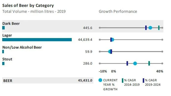 Beer is expected to record a declining 2% total volume CAGR over the forecast period, falling to 42.2 billion litres in 2024