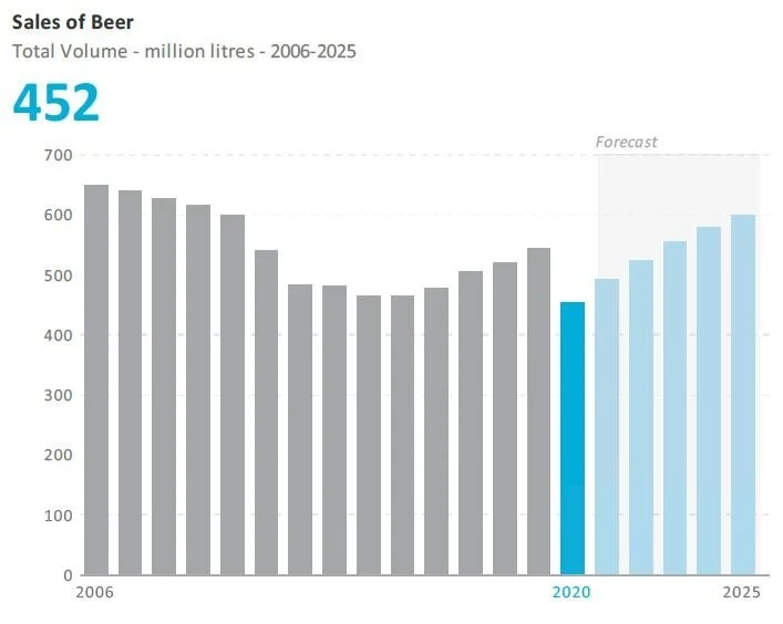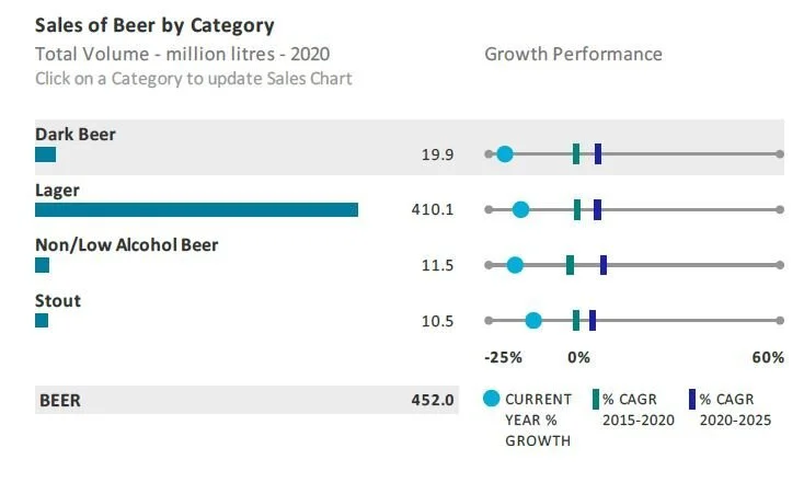 Beer is set to register a 6% total volume CAGR over the forecast period to reach 596 million litres in 2025