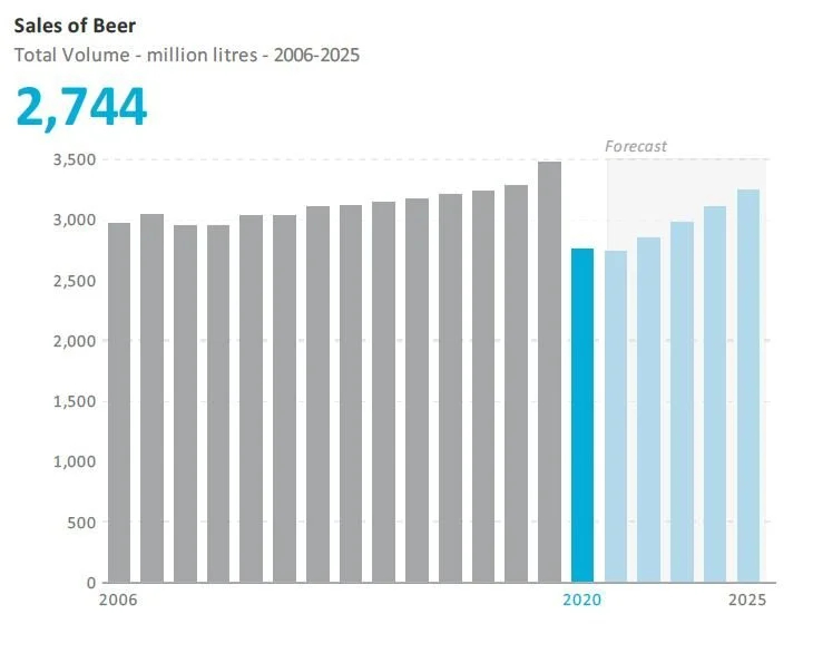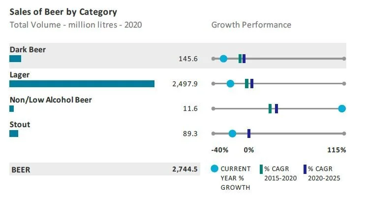 In 2020, total volume sales plummet by 21% to 2.7 billion litres. The only category to post total volume growth in 2020 is non-alcoholic beer, with a 113% sales rise