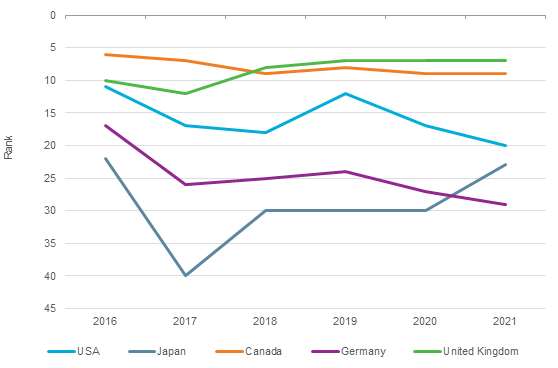Chart 25 Logistics Performance Index Ranking for Canada and Regional Comparison 2016-2021