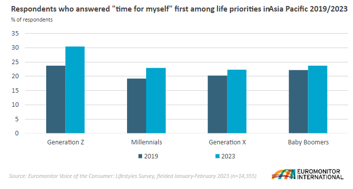 From 2019 to 2023, respondents who chose “time for myself” as their first life priority recorded the biggest growth among Generation Z, reaching 30% in 2023